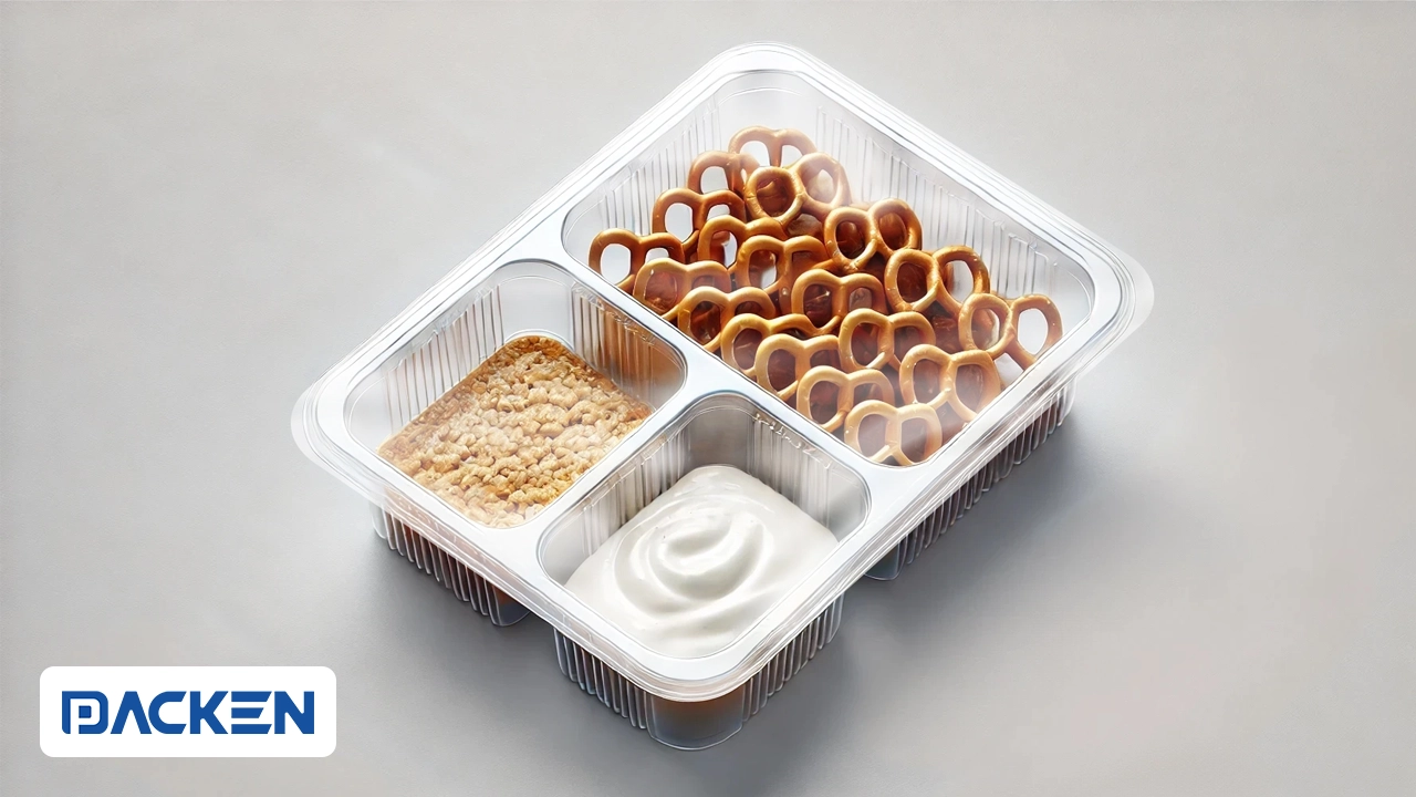 - ظروف با خانههای متعدد: طراحی ظروف بسته بندی با محفظههای مجزا برای تفکیک بخشهای مختلف مواد غذایی، موجب بهبود تجربهی مصرفکنندگان شده است. نمونههایی از این طراحیها شامل بسته بندیهای دوخانهای برند فیتزی فانزی و میندلا است که امکان نگهداری ترکیبی از مواد غذایی را در یک بسته بندی واحد فراهم میآورند.